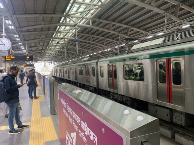 Namun, dari 16 stasiun yang saya jalankan di sini, hanya tiga (hijau) yang mengirim data kembali ke AS, saya kembali ke sini lagi bersama yang lain untuk membuatnya berfungsi kembali dan menambahkan tiga stasiun baru (putih). Saya memulai di ibu kota Dhaka untuk bergabung dengan rekan saya di Universitas Dhaka, dan mahasiswa pascasarjana saya Hasnat Jaman bergabung. Bersama-sama, kami menghabiskan minggu pertama saya dalam pertemuan dengan berbagai lembaga untuk merencanakan proyek baru. Metro Dhaka yang ditinggikan membuat berkeliling kota menjadi lebih mudah. 16 juta orang lebih mudah. Ini adalah pertama kalinya Jaman berada di Metro karena ia telah berada di Amerika Serikat selama tiga tahun terakhir. Baginya, metro yang besar, bersih, dan efisien tidak terasa seperti Dhaka.