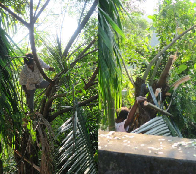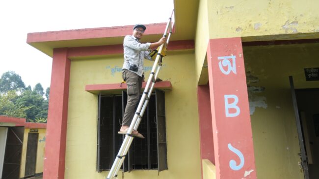 Stasiun pertama kami, bernama Juri, berada di klinik medis setempat, dengan kotak peralatan di ruang bersalin. Di sini, sistem pengisian baterai dan panel surya berfungsi, tetapi kami mengganti modem komunikasi untuk perbaikan di hotel kami. Di atap, kami menemukan antena telah retak akibat terik matahari dan hujan selama bertahun-tahun, dan terisi air. Setelah menggantinya dengan yang baru, kami meminta penebang pohon setempat menebang beberapa pohon yang menghalangi pandangan antena ke langit. Ini adalah masalah permanen di situs ini yang tidak kami sadari saat memasangnya pada tahun 2007. Semakin bagus pemandangan langit, semakin akurat perkiraan posisi antena. Semua ini memakan waktu, jadi kami akhirnya berhenti untuk makan siang pada jam 5 sore dalam perjalanan dua jam kembali ke bungalo kami di resor teh dan museum di luar Sreemangal.