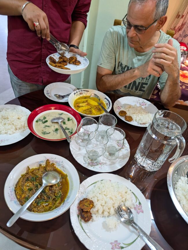 Lokasi sekolah ketiga berada di seberang lembah yang luas dari desa tempat Singha dibesarkan. Ketika kami selesai bekerja, kami pergi ke rumah keluarga Singha untuk menemui orang tuanya, paman dan neneknya. Kami disambut dengan hidangan Manipuri buatan rumah yang lezat termasuk tiga jenis ikan. Singha dan keluarganya adalah Manipuris Bangladesh, etnis minoritas yang beragama Hindu dan tidak makan daging. Ada sekitar 25.000 manipuri di Bangladesh yang tinggal di wilayah Sylhet. Setelah makan malam, kami berkeliling rumah dan kemudian menonton film pernikahan Singha pada bulan Mei lalu.