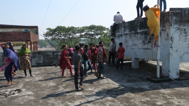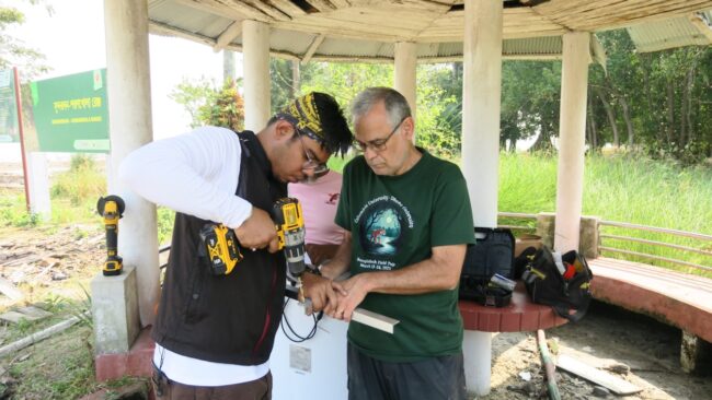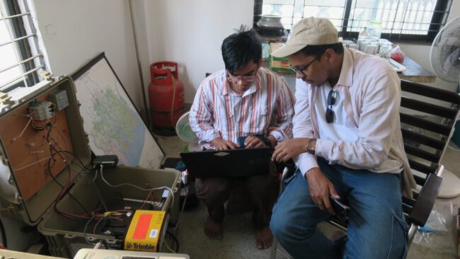Selama kami di sini, kami juga memulihkan stasiun GNSS di Universitas Rajshahi. Dipasang dengan anggaran terbatas, receiver ini sudah usang saat dipasang pada tahun 2003. Ia bertahan hingga tahun 2009, namun batang berulir yang dibaut ke atap masih ada dan dapat digunakan. Jauh dari zona tektonik di timur dan zona pesisir di selatan, Rajs akan bertindak sebagai situs referensi yang lebih stabil. Kami mengunjungi lokasi tersebut pada malam kami tiba dan memulai instalasi pada malam hari kedua konferensi, dan menyelesaikannya pada hari berikutnya. Bagian terpentingnya adalah memastikan kita mengetahui posisi antena baru relatif terhadap titik referensi antena lama. Kami menggulung panel surya ke atap dan menyiapkan kotak peralatan, dibantu oleh Binti, senior di departemen geologi yang tertarik dengan apa yang kami lakukan. Kami meluncur di bawah panel surya untuk melindunginya dari sinar matahari. Sementara Sanju, Zohur dan Binti menyelesaikan pemasangan dengan menambahkan batang pondasi, saya memberikan ceramah kepada mahasiswa jurusan Geografi dan Geologi.