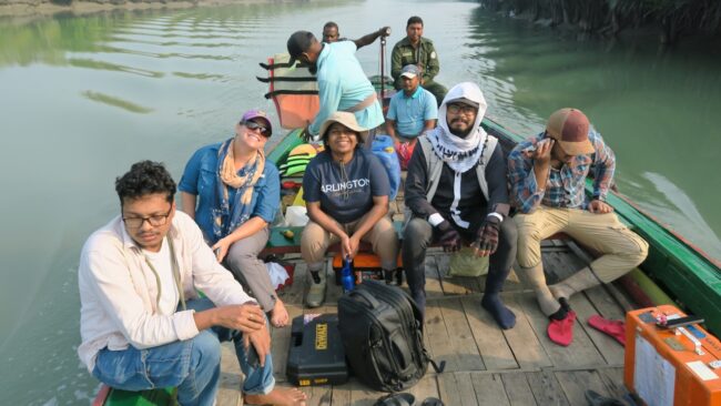 Saya melanjutkan perjalanan di sekitar zona pesisir Delta Gangga-Brahmaputra di Bangladesh untuk memperbaiki instrumen GNSS (GPS). Keberlanjutan delta di masa depan bergantung pada keseimbangan kenaikan permukaan laut, penurunan permukaan tanah atau subsidence, tanah, dan pengendapan sedimen yang dapat membantu menjaga daratan. Instrumen GNSS saya mampu mengukur penurunan delta lebih dari 1 mm/tahun. Instrumen kami ditempatkan bersama dengan RSET-MH (penanda elevasi permukaan ROD) yang mengukur perubahan ketinggian dan laju sedimentasi. Tim saya dan tim RSET, dipimpin oleh Carol Wilson dari Louisiana State University, melakukan perjalanan bersama dengan perahu untuk mengakses lokasi kami yang lebih jauh.